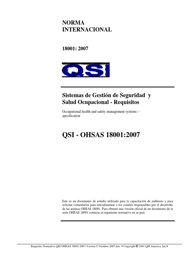 Norma_OHSAS_18001_2007_Espanol.pdf | Seguridad y salud ... from imgv2-2-f.scribdassets.com Understanding, implementation of occupational health and safety management systems (ohsas). The ohsas 18001 standard does not prescribe what hazards or risks should be significant, or how to determine their significance. Ohsas 18001:2007 addresses the following key areas: Has been audited by sii and found to comply with the occupational health and safety management standard si ohsas 18001:2007. Ohsas 18001 occupational health and safety standard uses a management approach tool called the pdca cycle. Hazard identification, risk assessment and determining controls. The occupational safety & health management system is applicable to the management of the occupational safety & health aspects related to: Addresses of applicable premises & site(s).